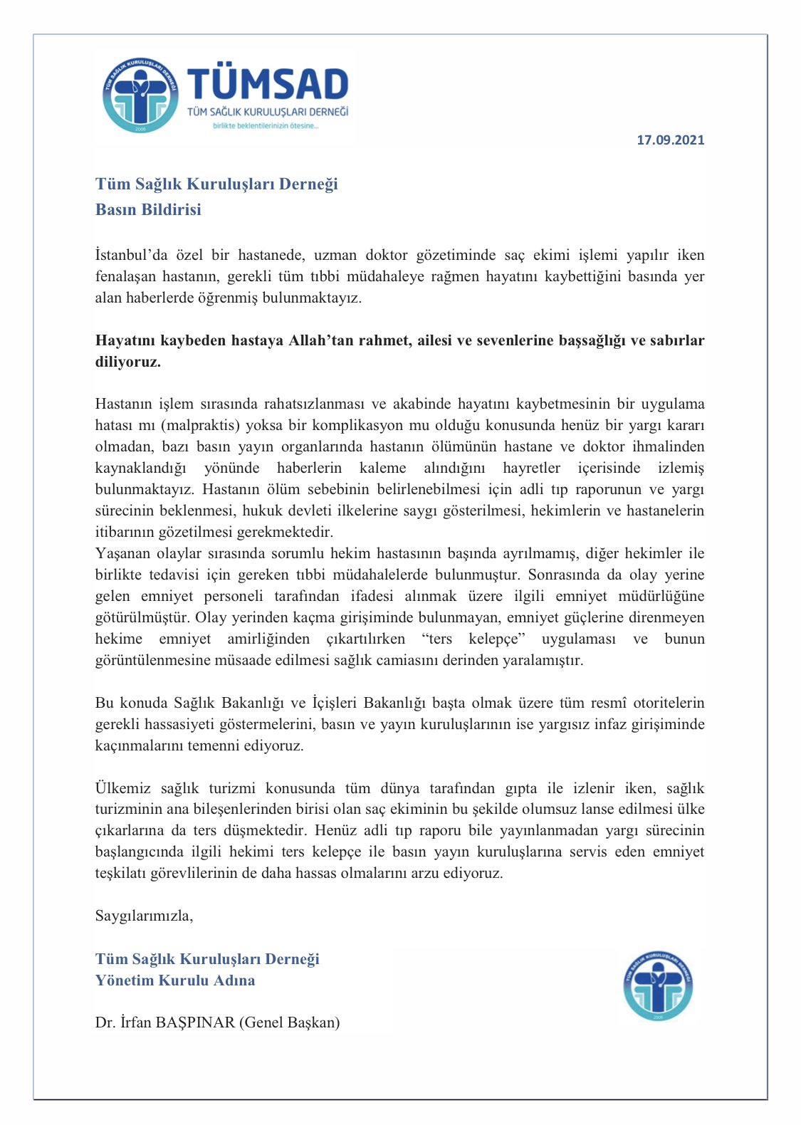 Saç ekimi sırasında fenalaşarak hayatını kaybeden hastanın işleminden sorumlu hekime ifade vermek için götürüldüğü emniyet müdürlüğünden çıkartılırken “ters kelepçe” uygulanması ve bunun görüntülenmesine müsaade edilmesi tüm sağlık camiasını derinden yaralamıştır.